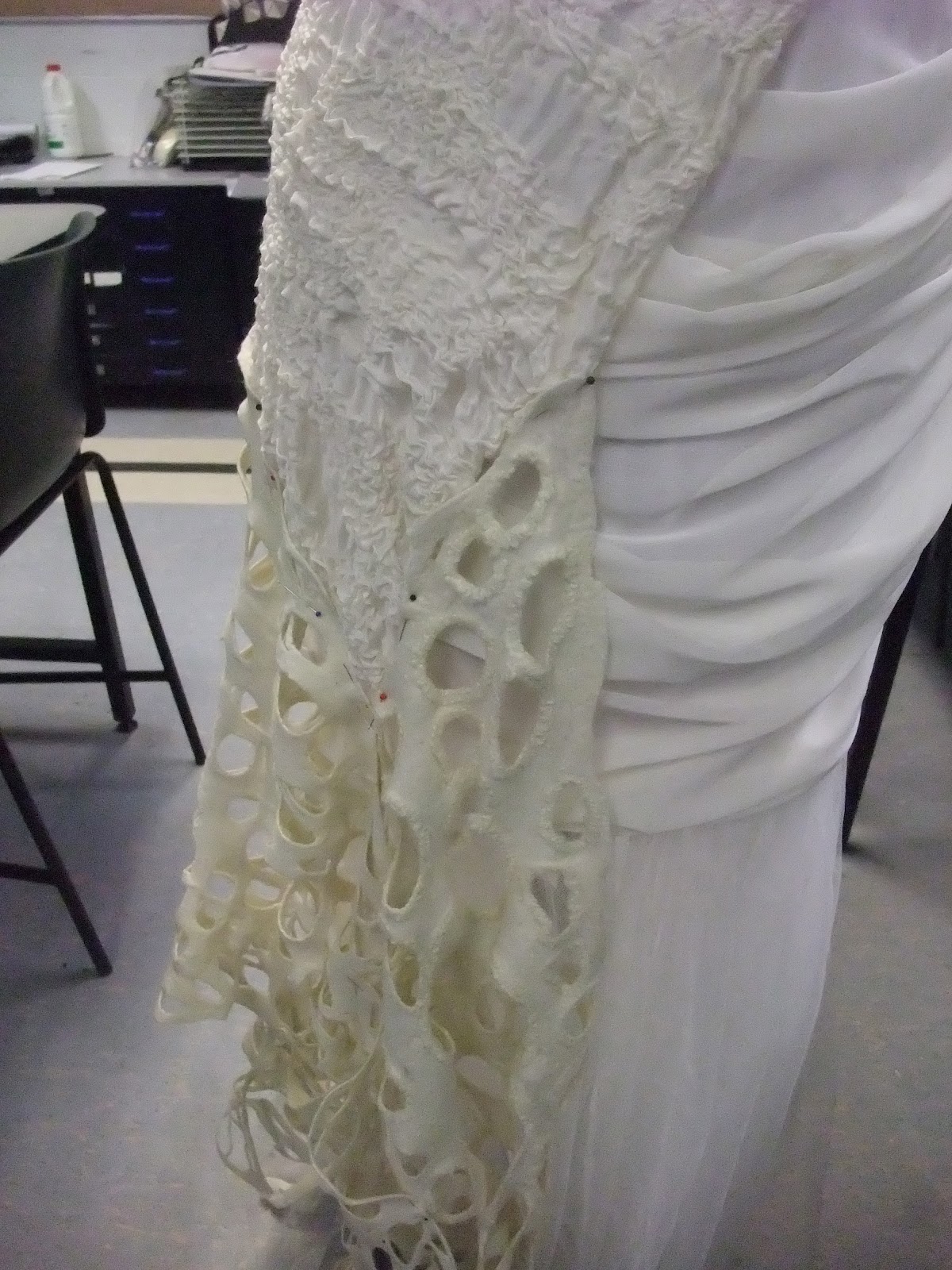 I sampled quite a few pieces of fabric for the nuno felt, this was going to be the main fabric for the most part of the dress so I wanted to get it right . I haven't used this technique before so I wasn,t as familiar with the shrinkage as I am with the wet felting.The first 2 pieces I made were too small as it shrank a lot more than I had allowed for.I needed a large piece of silk so I had to use my kitchen blind as this was the only thing large enough to roll.This was really time consuming and exhausting.After a few attempts I was happy with the 2 pieces I made for the front and the back.I made two large pieces of felt with lots of holes to create texture and interest for the outside layer of my dress (I soon realised I would need a few more to get the effect I was looking for) I made another 6 pieces to give me the fullness I wanted.I wanted to also use the vinyl cutter to cut some small delicate trees from my drawings to place on the skirt.I sampled a few colours and settled for the gold. Finally I had all the separate pieces I needed to start constructing my dress